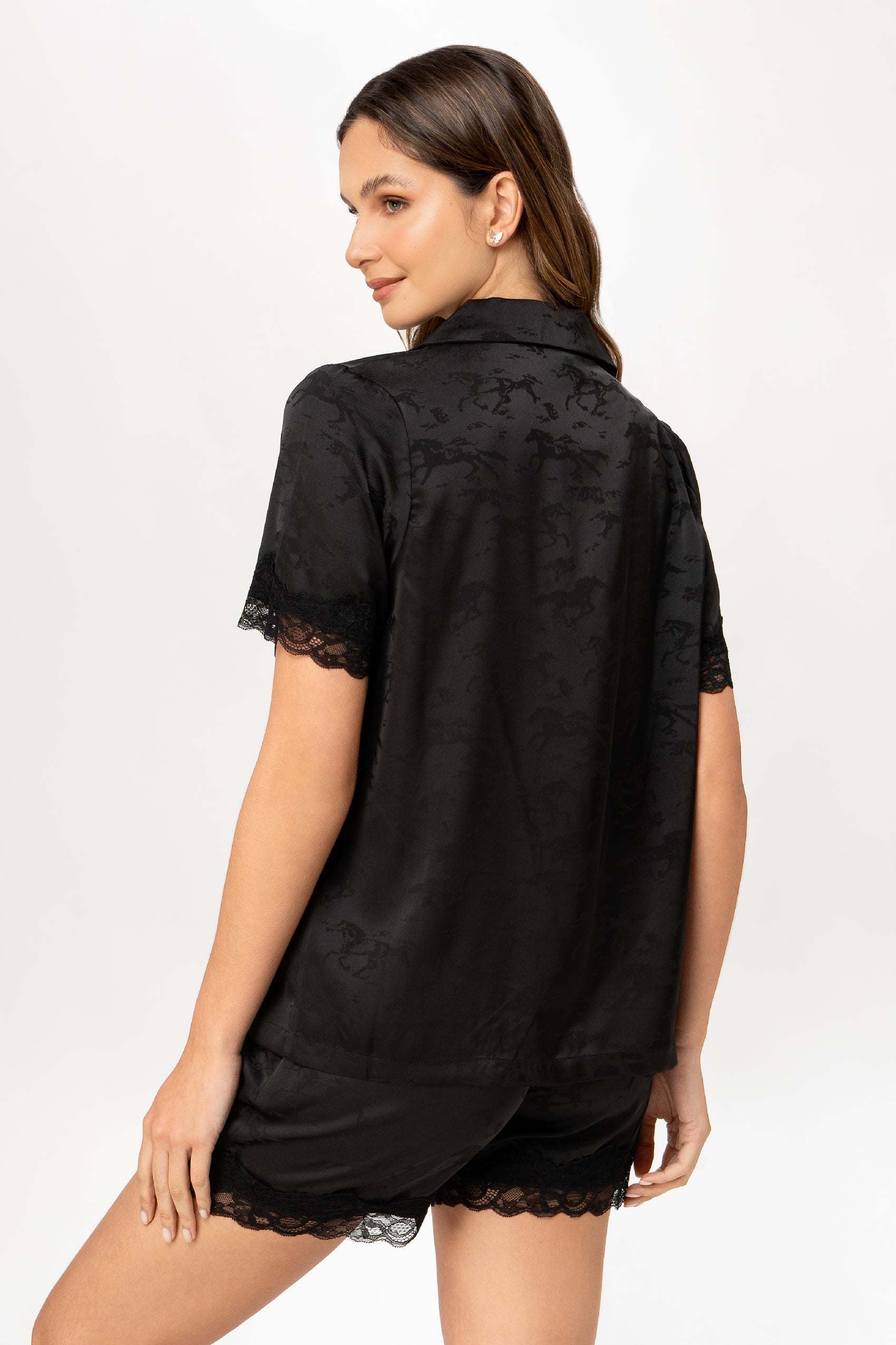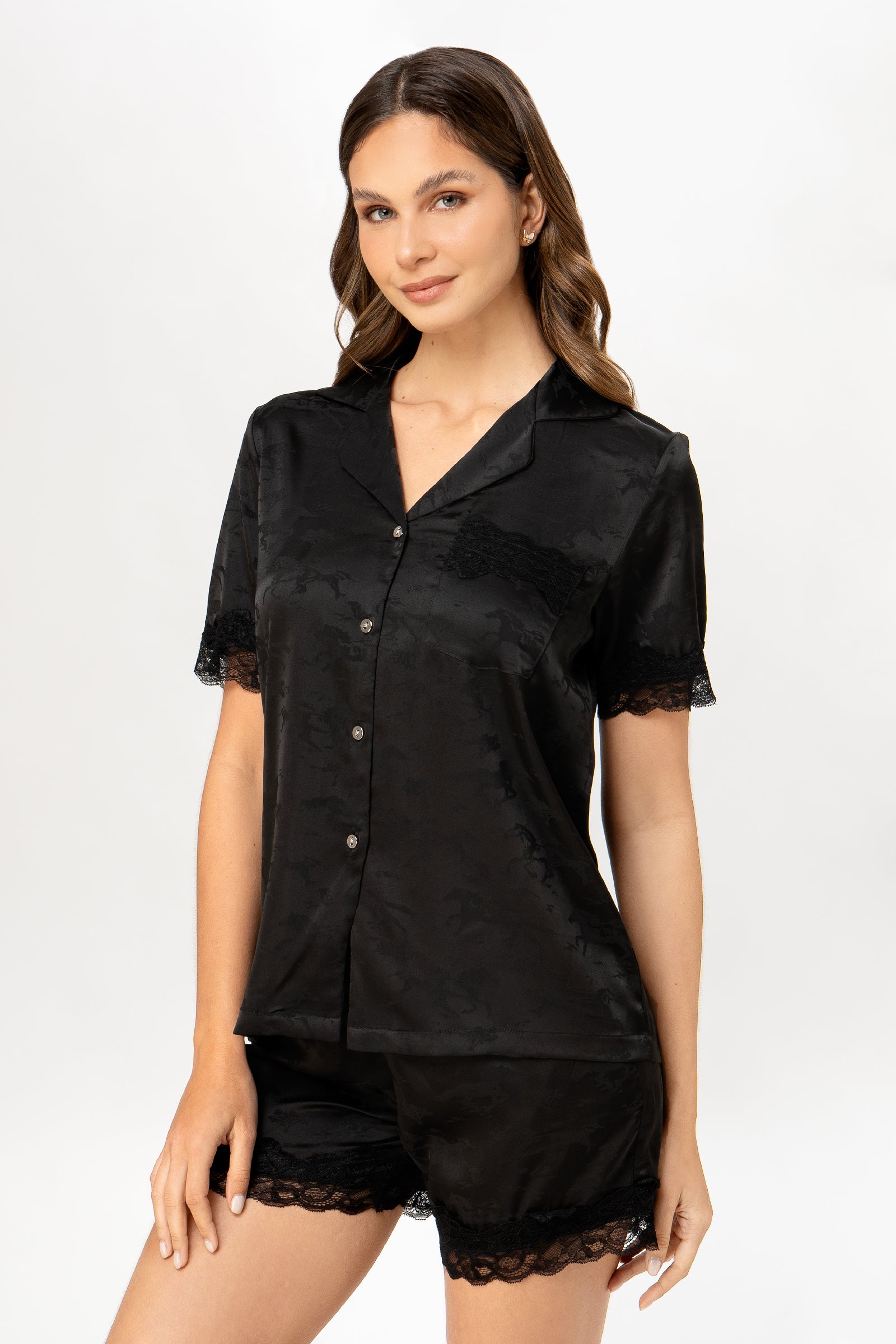 La Pijama Salomé combina el toque clásico del satén negro con delicados detalles de encaje, creando una pieza atemporal y sofisticada. Su textura suave y ligera brinda una sensación de frescura al contacto con la piel, mientras que su corte clásico tipo camisero ofrece comodidad sin perder estilo.