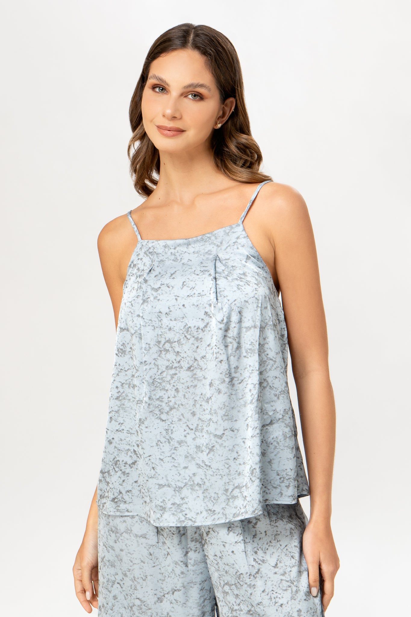 Pijama de dos piezas: top de tiras delgadas + pantalón tipo palazzo.